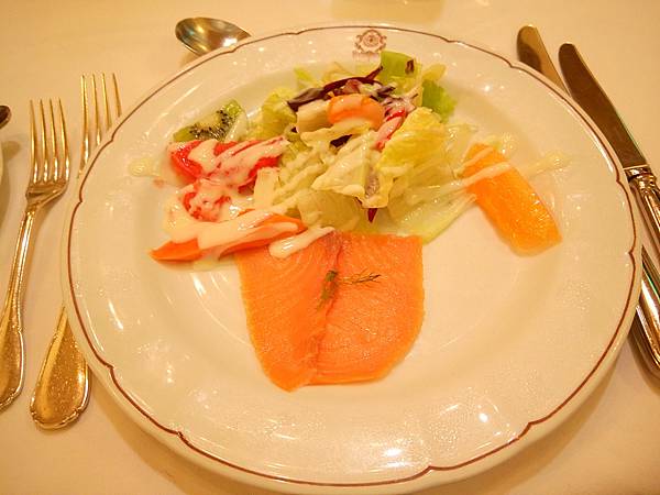 我的前菜是"煙燻鮭魚水果優格沙拉",鮭魚還不錯,水果優格沙拉則是表現的中規中矩,