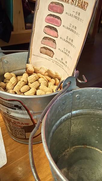 Texas Roadhouse 在桌邊都有附上一桶花生,還蠻好吃的,