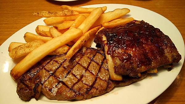 於是我們點了一份雙主菜套餐,肋眼牛排+醬烤豬肋排,