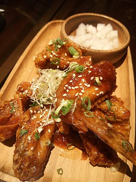韓式炸雞,外面裹了甜甜的韓式辣醬,還不錯吃,