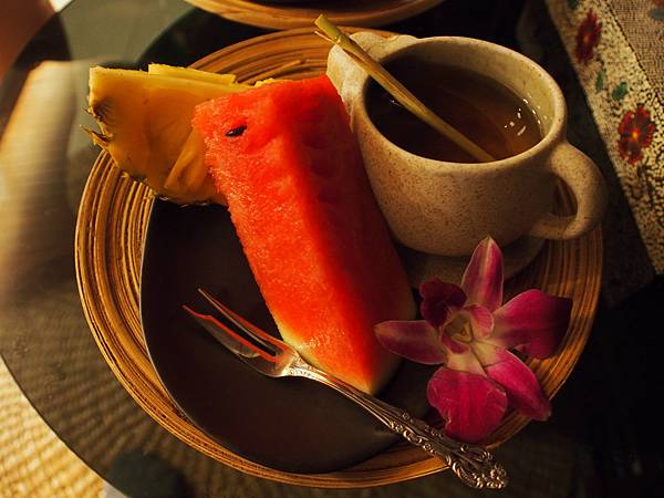 茶是香茅茶,香香的還不錯喝,西瓜蠻甜的,鳳梨有點酸 XD