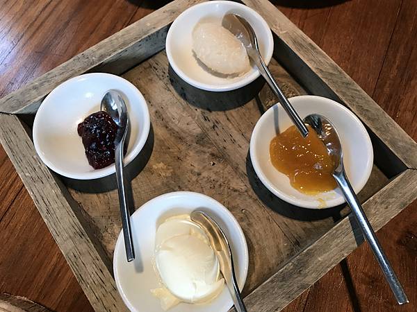 酥酥的外皮包含著鬆軟的內餡,搭配著一旁的奶油跟果醬,讓人不禁一口接著一口,